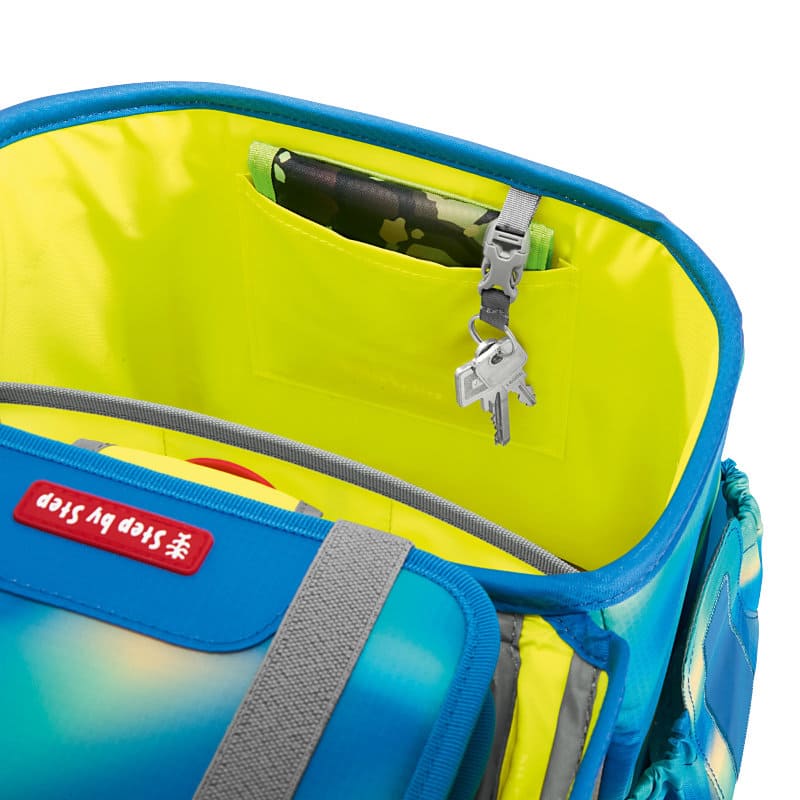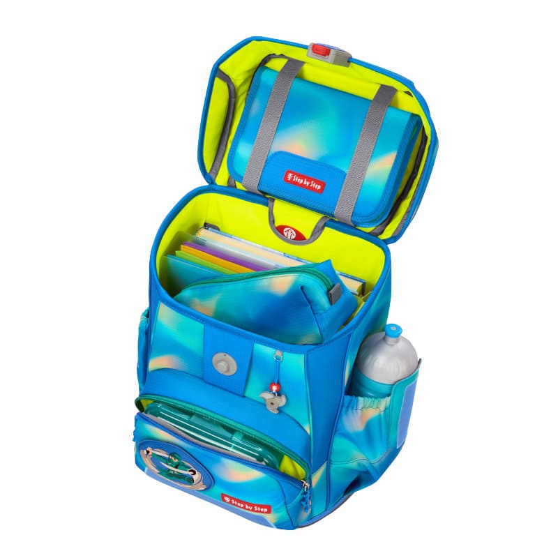 Das große Hauptfach mit integriertem Bücherfach, die nach außen wachsenden Front- und Seitentaschen ermöglichen ein Verstauvolumen von 19 Litern. Die Vordertasche ist isoliert mit Auslaufösen und ideal für das Pausenbrot und hält das Obst den ganzen Tag über frisch. Das Mäppchen wird mit Laschen platzsparend im Deckel des Ranzens verstaut. Auch der Stundenplan findet in diesem leicht und doch geräumigen Ranzen seinen Platz im Deckel.