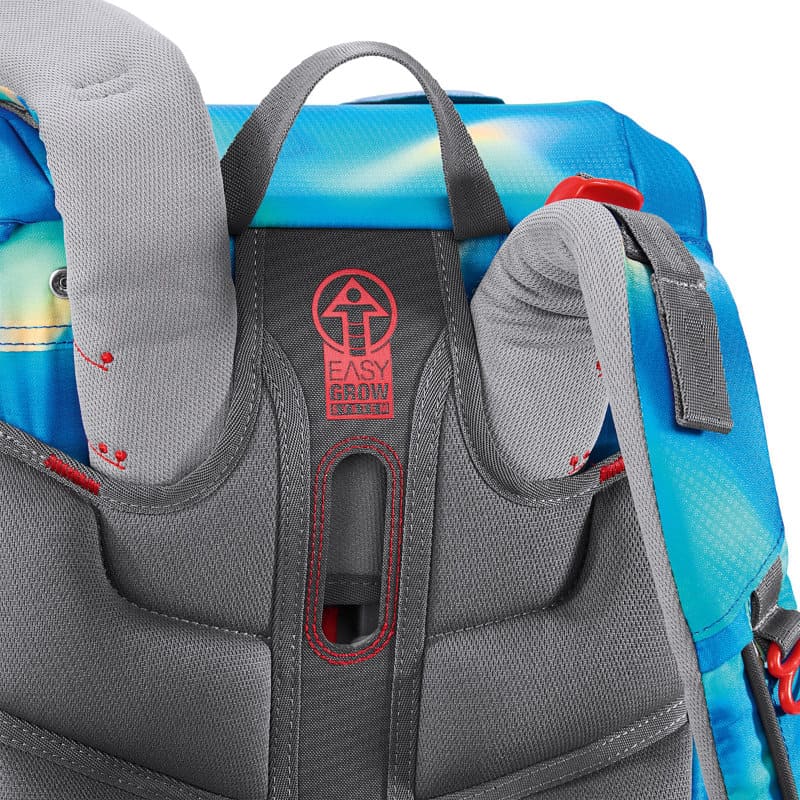 durch das patentierte Easy Grow System kann mit einem Drehgriff im Inneren des Space die Höhe der Schulträger und damit die Rückenlänge des Ranzen unkompliziert und individuell angepaßt werden. Der Cloud kann von einem besonders zierlichen, kleinen Schulkind getragen werden.