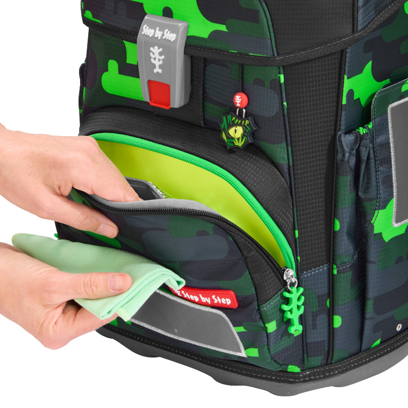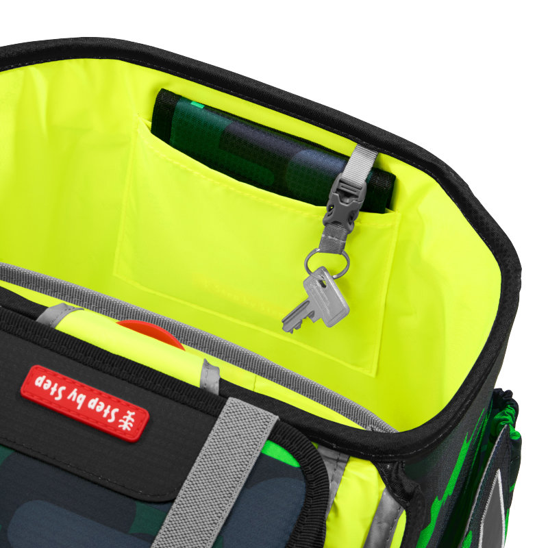 Das große Hauptfach mit integriertem Bücherfach, die nach außen wachsenden Front- und Seitentaschen ermöglichen ein Verstauvolumen von 19 Litern. Die Vordertasche ist isoliert mit Auslaufösen und ideal für das Pausenbrot und hält das Obst den ganzen Tag über frisch. Das Mäppchen wird mit Laschen platzsparend im Deckel des Ranzens verstaut. Auch der Stundenplan findet in diesem leicht und doch geräumigen Ranzen seinen Platz im Deckel.