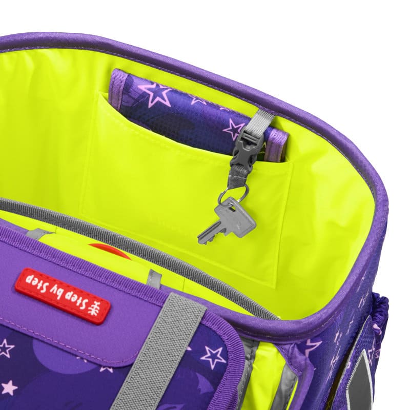 Das große Hauptfach mit integriertem Bücherfach, die nach außen wachsenden Front- und Seitentaschen ermöglichen ein Verstauvolumen von 19 Litern. Die Vordertasche ist isoliert mit Auslaufösen und ideal für das Pausenbrot und hält das Obst den ganzen Tag über frisch. Das Mäppchen wird mit Laschen platzsparend im Deckel des Ranzens verstaut. Auch der Stundenplan findet in diesem leicht und doch geräumigen Ranzen seinen Platz im Deckel.