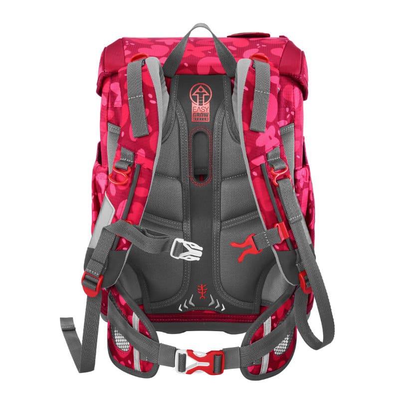 Der höhenverstellbare, abnehmbare Brustgurt und der abnehmbare Hüftgurt helfen das Gewicht von den Schultern auf den ganzen Körper zu verteilen. Die Lageverstellriemen sorgen für eine zentrale Platzierung auf dem Rücken. Der Ranzen läßt durch seine Gurte und die optimale Einstellung perfekt zum Bus sprinten. Ranzen auf, Gurte nachziehen und auf geht`s.