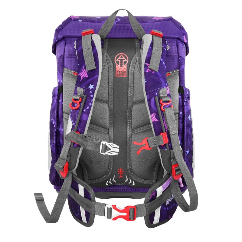 durch das patentierte Easy Grow System kann mit einem Drehgriff im Inneren des Space die Höhe der Schulträger und damit die Rückenlänge des Ranzen unkompliziert und individuell angepaßt werden. Der Fit kann von einem Schulkind mit der Körpergröße von 100 bis 150cm getragen werden.