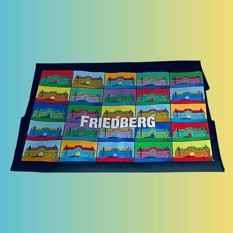 Dieser schwarze Baumwollbeutel ist ein modernes und praktisches Souvenir aus Friedberg. Das ausdrucksstarke Popart-Motiv zeigt den südlichen Eingang der Friedberger Burg und verleiht dem Beutel einen kreativen, urbanen Look mit lokalem Bezug.