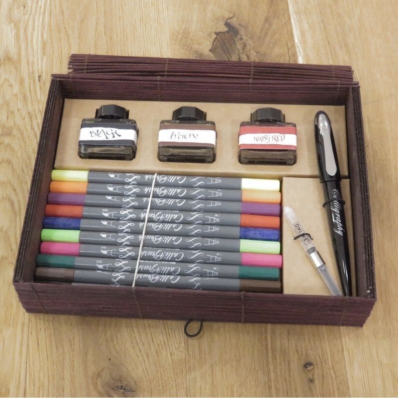 Kalligrafie Füllhalter, Tinte, Brush Pens und Grußkarten in einer Bambus Box