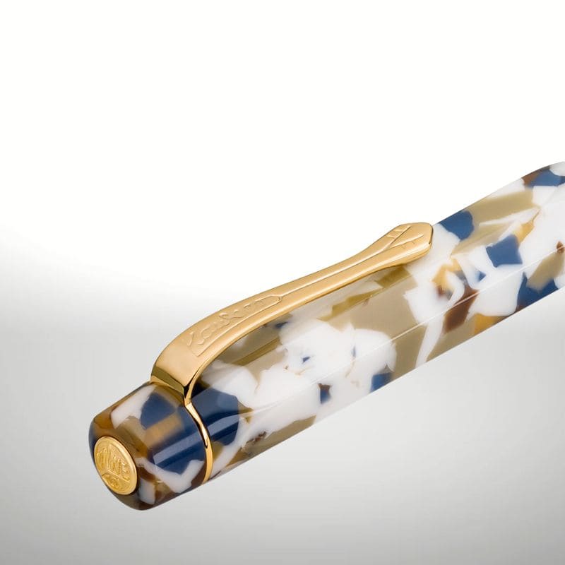 Ein Füllhalter voller Charakter und faszinierender Muster – ähnlich dem traditionellen Terrazzo-Bodenbelag begeistert der Kaweco Art Sport Füllhalter mit seinen farbenfrohen Mosaikintarsien. In Kontrast zum cremefarbenen Grundmaterial kommt das Farbenspiel des Schreibgeräts besonders elegant zur Geltung. Die hochglänzende Oberfläche des hochwertigen Acryls macht den Füller zu einem luxuriösen Handschmeichler. Dank des kunstvollen Gießprozesses entstehen einzigartige Texturen, die jedes Schreibgerät zu einem Unikat machen. Die goldenen Elemente verleihen dem Füllhalter ein warmes Aussehen und harmonieren wunderbar mit der harmonischen Farbkombination.