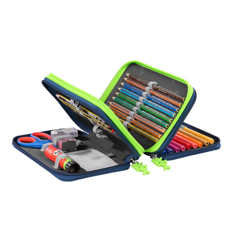 mit seinen 3 geräumigen Fächern beinhaltet alles, was das Schulkind zum Schreiben, Zeichnen, Malen und sogar Basteln  braucht.